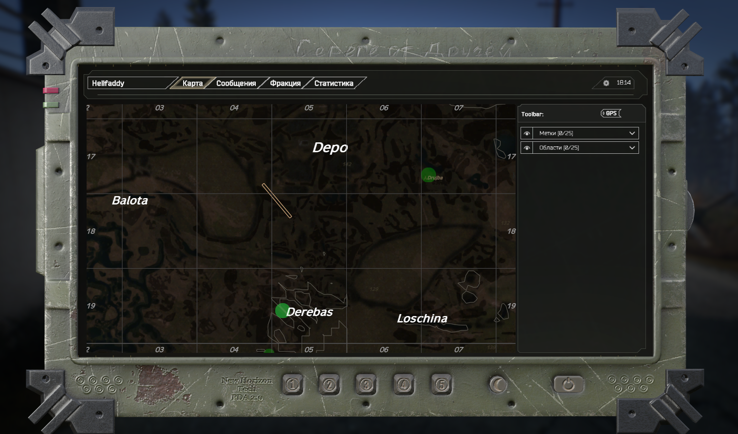 Описание ПДА: включается нажатием клавиши «M». Позволяет отправлять личные сообщения, добавлять других игроков в друзья, а также делиться своей геопозицией. Вы можете устанавливать метки и зоны (поля) в ограниченном количестве — до 25 штук каждого вида. Интерфейс очень прост и удобен для коммуникации между игроками.